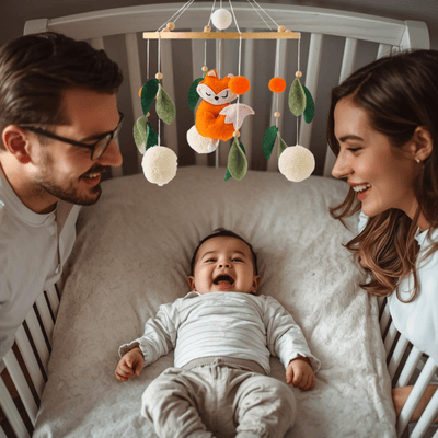 Notre Mobile bébé Virevolte™ est particulièrement apprécié pour ses figurines qui semblent danser dans l'air, captivant l'attention des tout-petits tout en les apaisants grâce à son mouvement hypnotique.